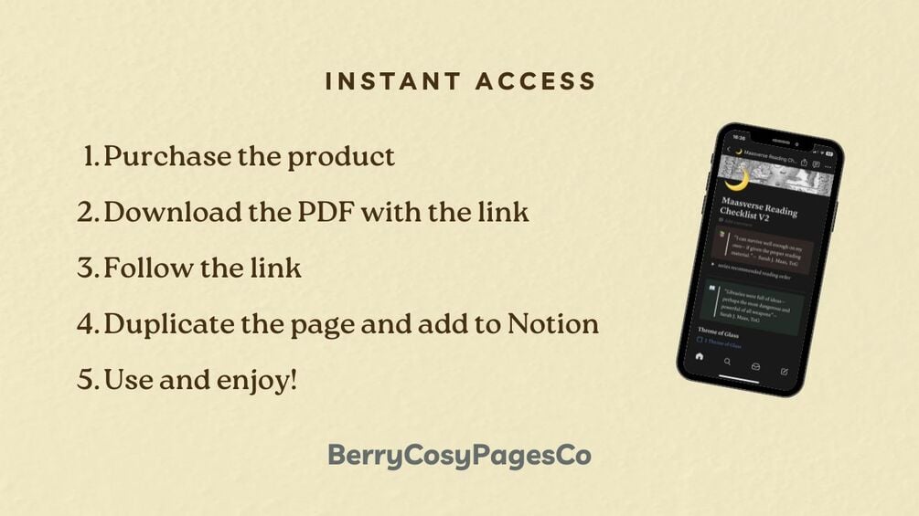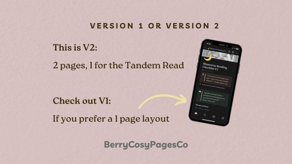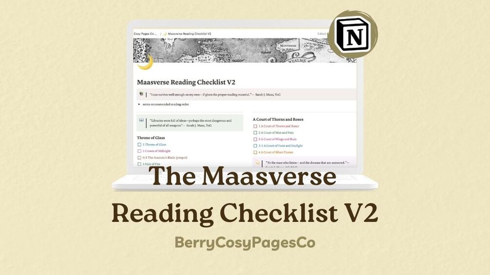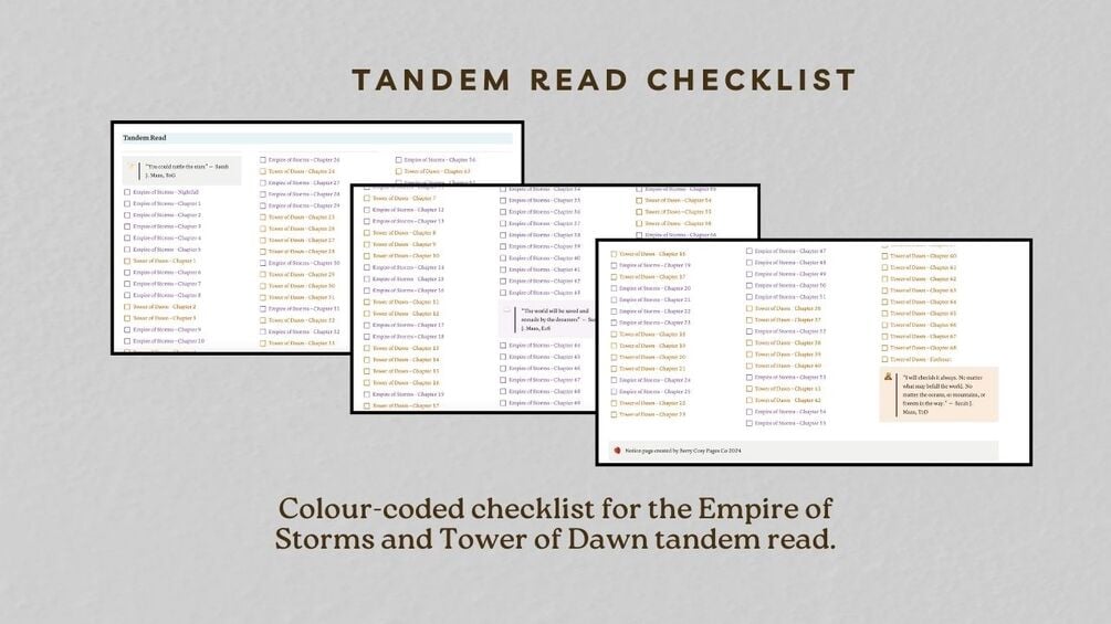 A simple, easy to use Notion checklist for reading ALL BOOKS by Sarah J. Maas. Includes a checklist for the Tandem Read of Empire of Storms and Tower of Dawn.