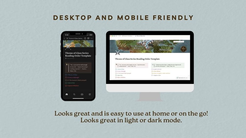 A simple, easy to use Notion checklist for the Throne of Glass Series by Sarah J. Maas. Includes a checklist for the Tandem Read of Empire of Storms and Tower of Dawn.